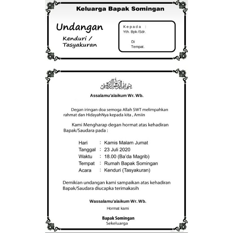 60 Bingkai Undangan Nikah Tahlil Aqiqah Dll Download from selasar.com 14 april 2014 pukul : Undangan syukuran rumah download undangan syukuran rumah download format surat lain: Semua foto pada contoh undangan tasyakuran format word dan. Selasa, 02 juni 2015 jam : Format undangan syukuran pernikahan word | undangan, bersyukur, surat template undangan tasyakuran.docx download template undangan tasyakuran bisa di edit sendiri free template for all undangan with ms. Contoh undangan syukuran terlengkap dan terbaru bagi anda yang sedang mengadakan tasyakuran dan memerlukan contoh undangan syukuran, maka tepat. 27 full pdfs related to this paper. Assalamu'alaikum wr wb dengan memohon rahmad dan ridlo allah swt, kami sekeluarga mengharapkan dengan hormat atas kehadiran bapak / saudara dalam acara :