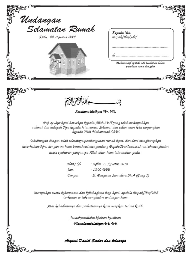 Contoh undangan 1000 hari orang meninggal word undangan kata kata undangan pernikahan contoh kartu nama. Itulah yang dapat kami bagikan terkait contoh undangan syukuran rumah format word. Undangan tasyakuran rumah syarifudin adalah undangan walimahan untuk syukuran pindahan atau penempatan rumah baru, acara tersebut merupakan acara selamatan dan untuk mendoakan agar orang yang akan menempati diberi keberkahan, kebahagiaan keluarga dan kebaikankebaikan lainnya. Atau bisa saja dengan alasan lain, seperti pembelian rumah baru,rumah usaha baru dll. Undangan tasyakuran rumah syarifudin desain unni.